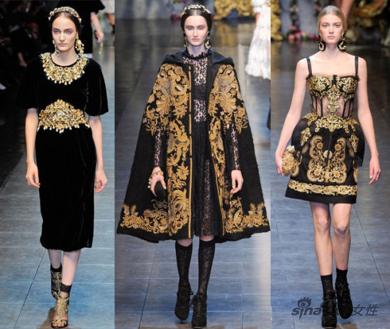 柳岩腰间与背后的金色刺绣彰显富贵华丽之感,最能体现这种奢华富贵的当然要数DOLCE&GABBANA秀场上的巴洛克风,黑色的蕾丝与丝绒嵌上金色的刺绣,富丽堂皇之感让人迷醉。