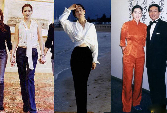 OL必备款的西裤,无论是弧形裤腿的还是直筒的都能让双腿增长不少。巩俐本就魁梧的身材穿上它,立即变得修长提拔。而且那种干练简洁的气质也自然流露出来。