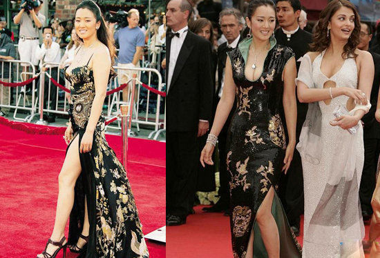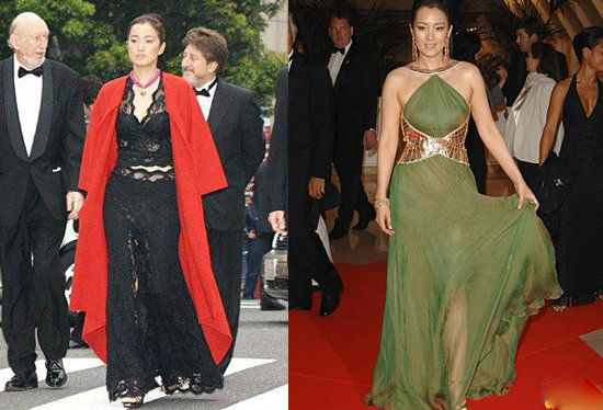 开衩款的礼服一直都是女星们大秀美腿的首选。巩俐的改良式旗袍完美无痕的亮出了胸器,完全贴身的设计也显出她的丰盈身段。开至大腿中部的尺寸掩盖了浑圆的大腿,只露出纤细小腿不失为明智之举。
