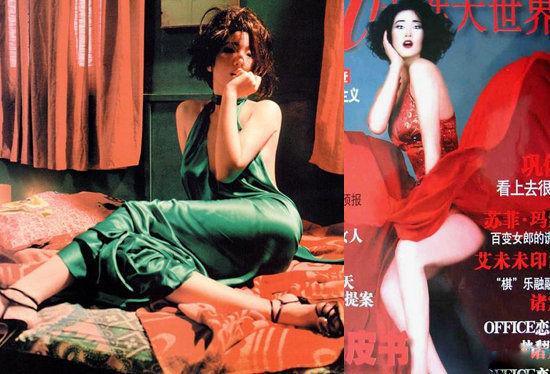 顺滑、柔软如丝的绸缎面料是礼服的常见材质,因能很好的贴合女性身体曲线,展示出女人的柔美而备受设计师的亲睐。巩俐的墨绿色深V露背礼服,就把她的双腿勾勒的淋漓尽致。充满中式韵味的红色礼服裙也衬出了她的白皙肌肤。