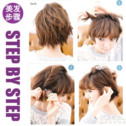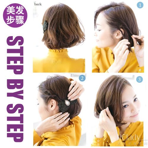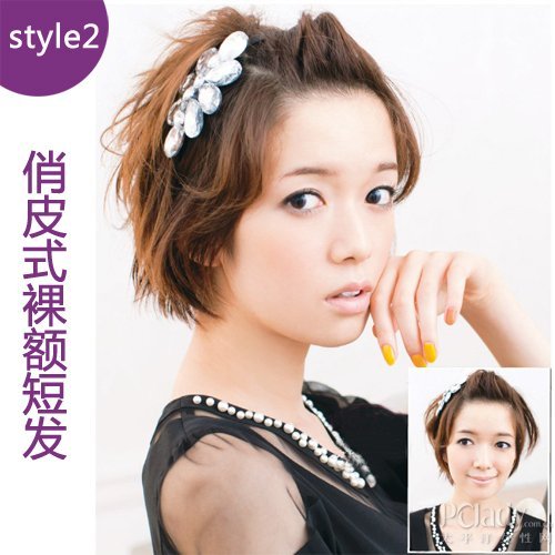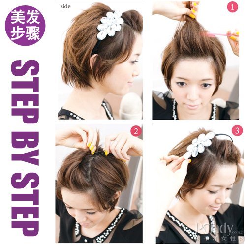 头发太短的MM发型变化较少,但如果要在短时间内变化多种发型,一定要善用“扭”和“收”的技巧,才能又快又有效率。这款简单而不失俏皮气质的裸额短发也有另一番味道,加上甜美的发箍点缀,使整个造型充满灵气!