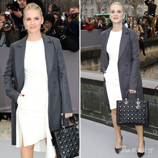 梅拉尼·罗兰(Melanie Lauren)灰色大衣内搭白色连衣裙,手拿dior包包,黑色尖头鞋,整身造型贵气十足,圆形耳环增添年轻俏皮活力。