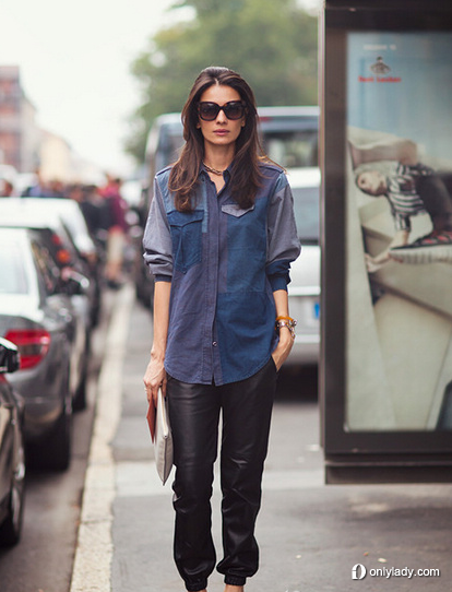 牛仔布拼色衬衫配休闲皮裤