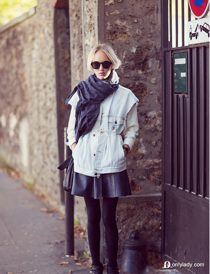 水洗蓝牛仔马甲配蓬蓬皮裙牛仔布拼色衬衫配休闲皮裤