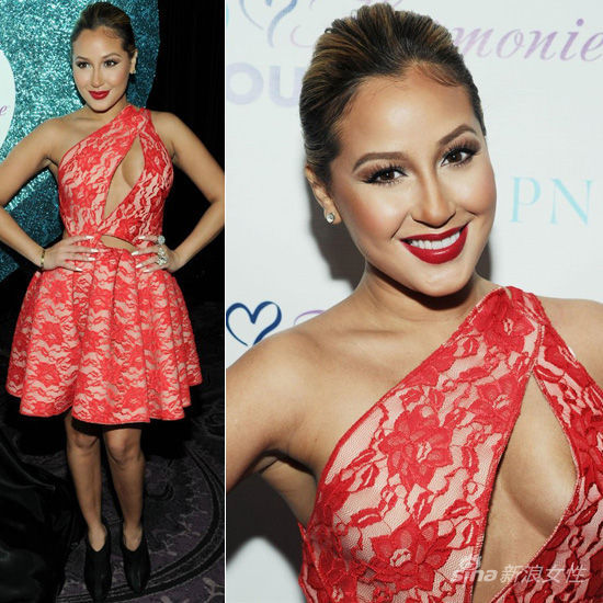 女星艾德里安妮-巴隆(Adrienne Bailon)身穿一件红色蕾丝提花中空单肩蓬蓬裙,脚踩一双黑色高跟皮短靴,性感胸部从镂空部位呼之欲出。