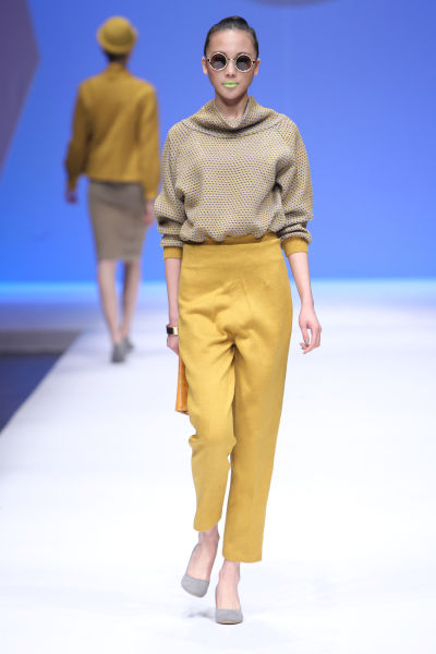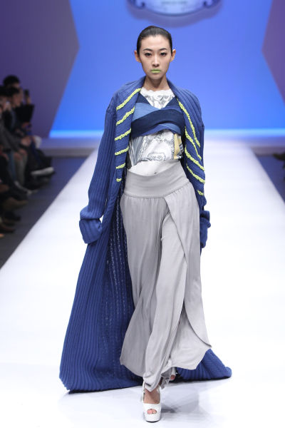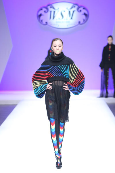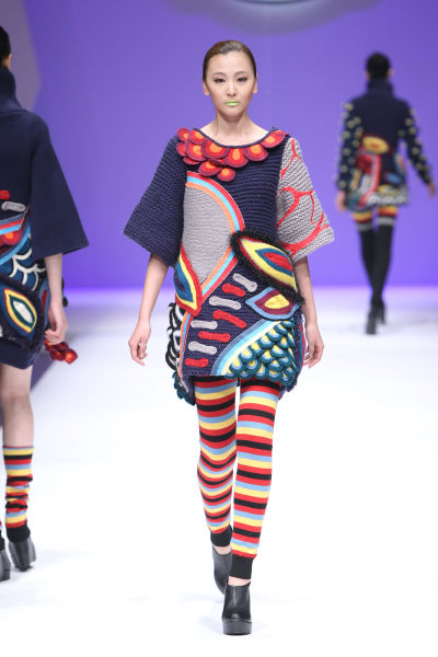 此次大赛的主题为“炫彩时代”,要求参赛者不仅要设计出时尚感强、贴近市场并富有设计创新的作品外,还要突出色彩在针织时装设计中的应用与创意。较往届,本届大赛的主要特色一方面是在颜色上有很大突破,这主要的原因也基于本届大赛主题“炫彩时代”的启发,另一方面撞色、拼色等工艺是今年针织趋势中比较突出的特色。从本届大赛入围作品来看,参赛选手们以色彩作为灵感源,将创作的初衷以色彩为起始点,较大程度考验了设计师在色彩方面的驾驭能力。除了在色彩方面有较大改观之外,此次大赛参赛作品从不同程度上反应了针织时装在工艺上的新特色,譬如不同面料以及不同工艺的拼接设计,拼色、拼纱线、拼针等手法来体现其作品的多层次性表达方式。