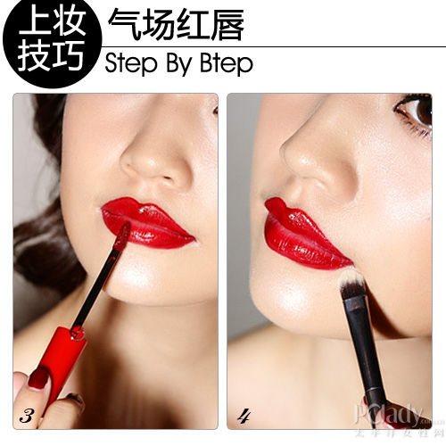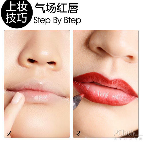一个成功的红唇取决于完美形状的唇部轮廓,先以红色唇线笔,沿着唇形的外围描绘,调整出对称的唇瓣与大小适中的唇型。