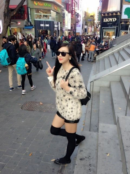 长毛衣+短裤的造型十分白搭,加上长袜和平底鞋,整体造型非常甜美亲切,身材比较高挑的MM们可以学习学习啊~!