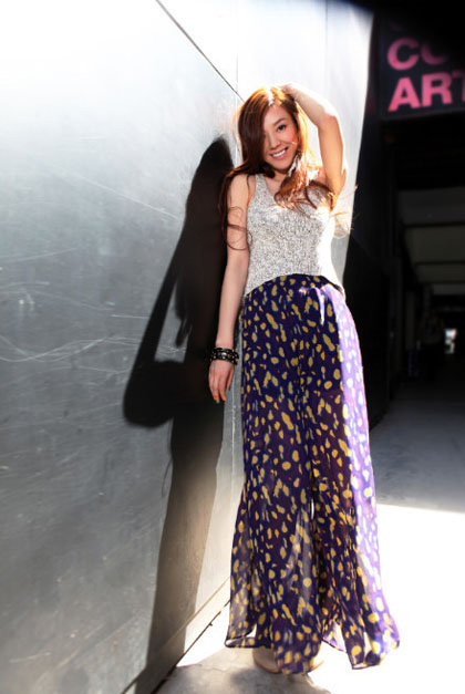女神穿衣搭配:灰色针织背心+紫色印花长裙