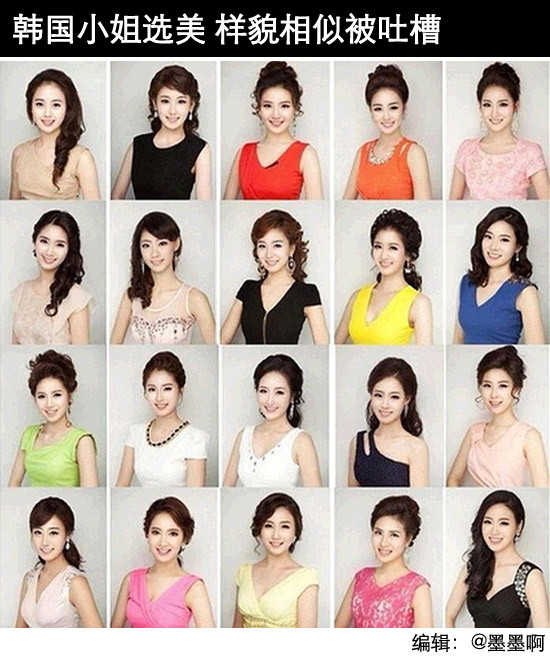 导语:比撞衫更尴尬的事情是什么?是撞脸!近日微博上曝光了2013年韩国小姐候选人,多位佳丽就集体撞脸了,她们看上去样貌神似,难以分辨,好似同一个人,还有网友制作了一组动态图加以展示,动态图中,仿佛变化的只是发型和衣服,而面部五官并无太大变化。网友调侃称:“亲们,你们是集体去的一家整容医院吗?这让评委好为难。”参与微博话题#韩国小姐#