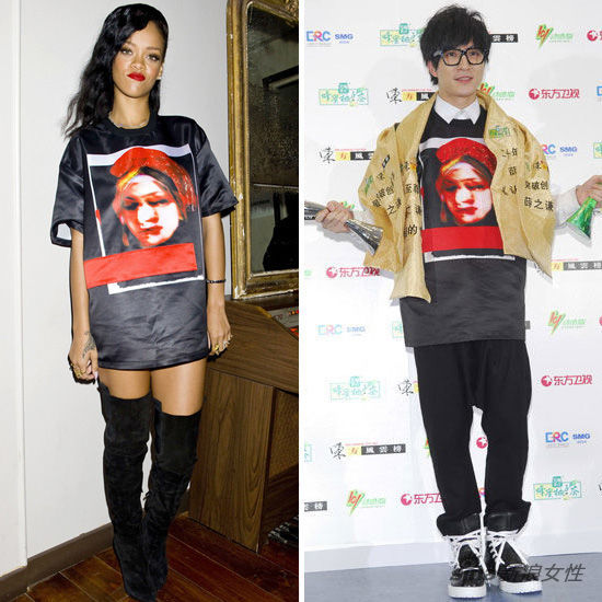 由设计师Riccardo Tisci所率领的Givenchy在近起年内可说是锋头正盛,2013春夏男装周上,圣母玛利亚系列将女性头像赋予纯白、浅粉、纯黑、蓝黑等色彩,充满浓郁的宗教元素,暗黑又神秘。蕾哈娜身穿Givenchy 2013春夏人脸印花Tee搭配长靴,朋克风十足。薛之谦则搭配黑色哈伦裤和黑色板鞋,黑框眼镜&白色领子展现浓郁的英伦范儿。