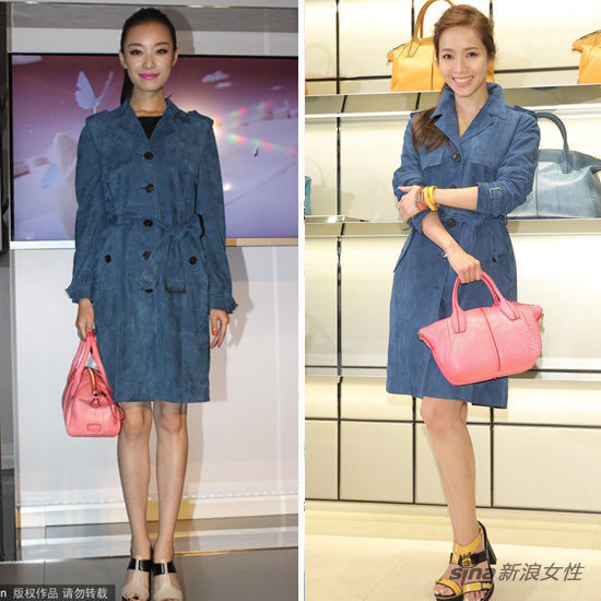 倪妮身穿Tod's藏蓝色麂皮风衣搭配粉色手袋,梳着马尾清清爽爽。这一身很大程度上与侯佩岑撞衫了。