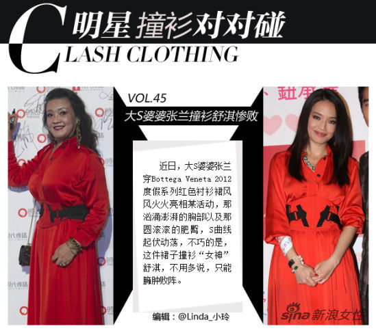 导语:近日,大S[微博]婆婆张兰穿Bottega Veneta 2012度假系列红色衬衫裙风风火火亮相某活动,那汹涌澎湃的胸部以及那圆滚滚的肥臀,S曲线起伏动荡,不巧的是,这件裙子撞衫“女神”舒淇,不用多说,只能臃肿败阵。