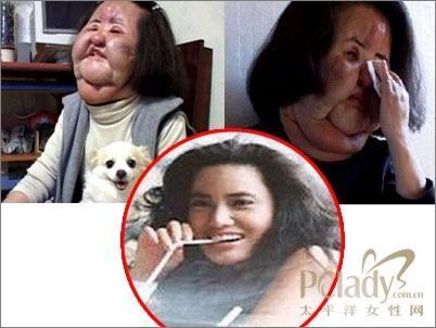 这原本是个美好的故事,偏偏坏在了女人的贪心上,韩某由于过大的脸盘被邻居们称为“电风扇大嫂”,她对于自己的四方脸也很不满,于是按照“冒牌整容医师”的指示,在自己的脸上注射了医生给的矽素成分的注射液,甚至还直接注射了豆油和石蜡。最后,四方脸?消除,反而脸比一般人还增大了三倍之多……就是现在照片上看到的这个样子。