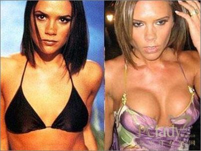 维多利亚曾一度否认做过隆胸手术,虽然地球人都知道她足球般的胸部和瘦削四肢并不太对称。没有修饰过的胸部其实很美。看得她手术后的胸部局部凹陷,是否和珍妮-杰克逊做了同样的手术,或去了同一家医院?
