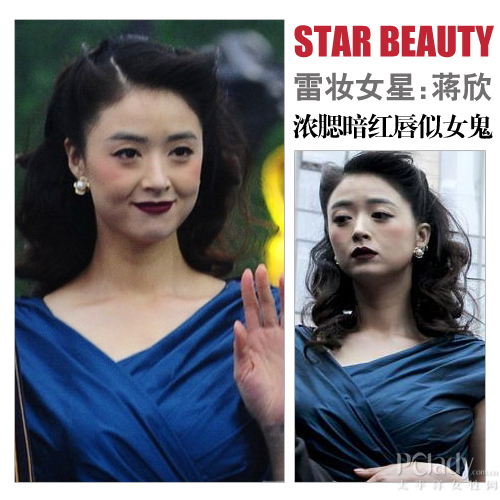 蒋欣因出演《甄嬛传》华妃一角而名气大扬,本来名气可以继续攀升,可惜之前北京国际电影节的亮相,却让她首当其冲成为了得罪化妆师的女明星。瞧那嘴唇的一抹暗红,与两颊的腮红颜色对比太严重,不禁让人感叹一声:这是见鬼了吗?另外,眉毛过于直硬,温婉的女人味一下子荡然无存呀!