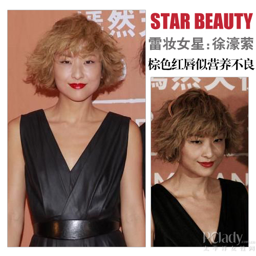 单看徐濠萦的局部妆容,小翅膀上扬眼线和复古红唇都是今年流行的妆容之一。无奈的是一向标榜个性的她,为她的潮妆搭配了一头烧焦了似的凌乱短发,让她的潮流指数顿时降到谷底,看起来像是营养不良似的。