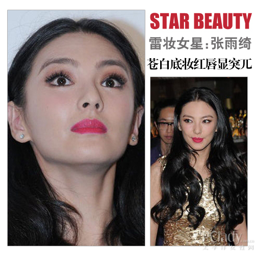 和蒋欣的妆容造型比起来,张雨绮的妆容整体来说还蛮精致的,复古风十足。但是无奈粉底过于苍白,让原本亮眼的桃红唇色异常突兀,实在让人hold不住啊。