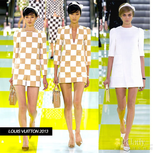 示范明星:莫小棋Louise vuitton 2013春夏系列的棋盘格是本季的潮流元素,泛着光泽的粉灰格短裙俏丽抢镜,而极简的设计又让造型利落有型,分外出彩。