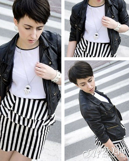 时尚解析纯白的棉质T恤,搭配黑纹竖纹包臀裙,佩戴手掌形状的银色挂链恰好弥补了纯白上衣的单调,黑色皮衣衬出浓浓的中性风。