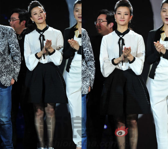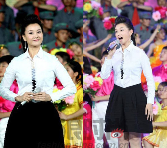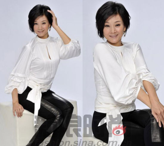 宋祖英时尚大方的白色圆领衬衫和凸现完美身材的黑色紧身皮革补丁护膝长裤的搭配,焕发出的都市时尚女性的女人味。