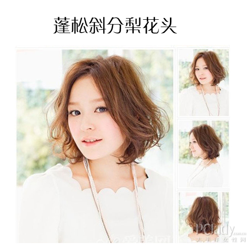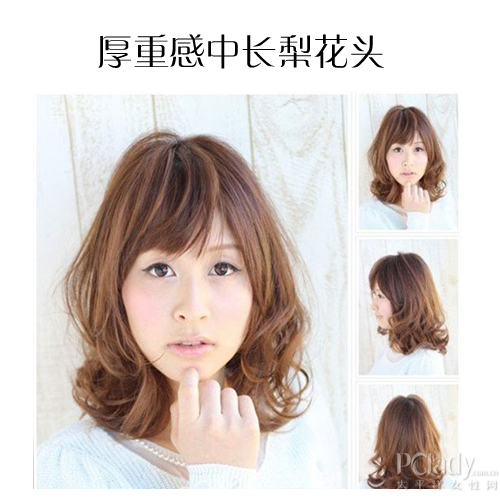 斜分的刘海搭配上层次感的不规则烫发梨花头,厚重感增加了发型的质感。