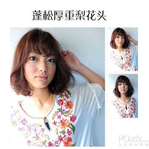 厚重的齐刘海遮盖住额头缺点,烫出蓬松的层次感不规则烫发,制造出个性的梨花头造型。