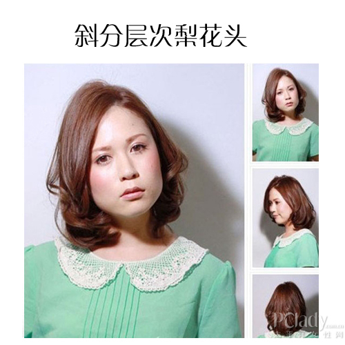 斜分的刘海更遮胖脸,搭配上发尾层次感的梨花头造型,个性十足。
