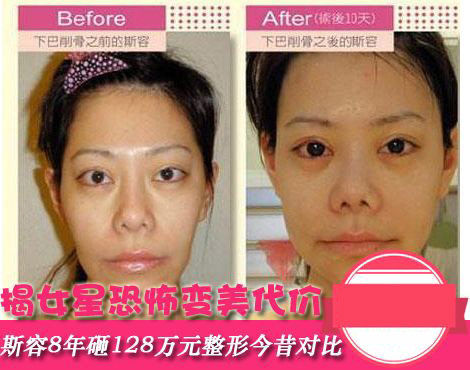 削骨手术后,斯容几个月内都感觉到自己脸部的下半部分没有感觉。终于有一天,牙疼。到医院一看,原来是牙髓神经坏死,四个臼齿全部烂掉。看牙又经历了惊魂一刻,撑开口腔,感觉下巴要掉下来了,拔牙后又推了回去。胡巧致分析称这还是因为挫伤了神经,“如果是手术中弄断了神经,是无法恢复的。”