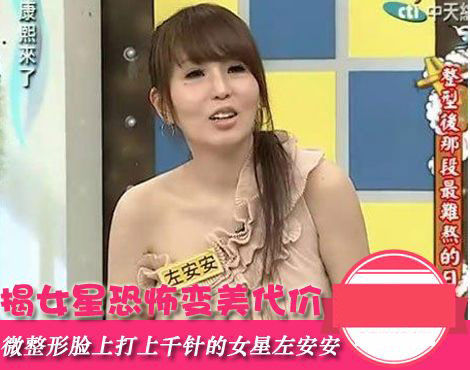 微整形脸上打上千针女星左安安到日本注射了肉毒杆菌、玻尿酸、微晶瓷、胶原蛋白等,这种不开刀的“微整形”备受女明星青睐。左安安讲述当时脸上至少打上千针,打成蜂窝状,肿胀非常严重。重要的是这样的痛苦过一段时间就得重复一次,因为微整形保持并不长久。