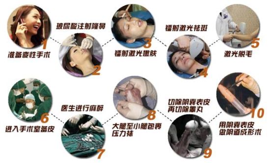 许多人妖都梦想彻底地从男人变成女人,rose也不例外,光靠吃激素打针是远远不够的,这时就要进行昂贵的变性手术,变性手术属于外科整形范畴,手术过程极其复杂, rose在面部、形体方面至少已经实施了十几个整形手术。