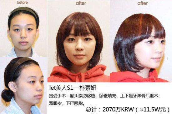 朴素妍接受的手术有:额头脂肪移植、卧蚕填充、上下颚牙床骨后退手术、双眼皮手术及下巴吸脂手术,费用总计2070万韩元,折合人民币约11.5万元。