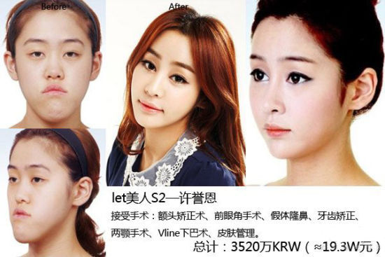 许誉恩接受的手术有:额头矫正术、前眼角手术、假体隆鼻、牙齿矫正、两颚手术、vline下巴术及皮肤管理,费用总计3520万韩元,折合人民币约19.3万元。