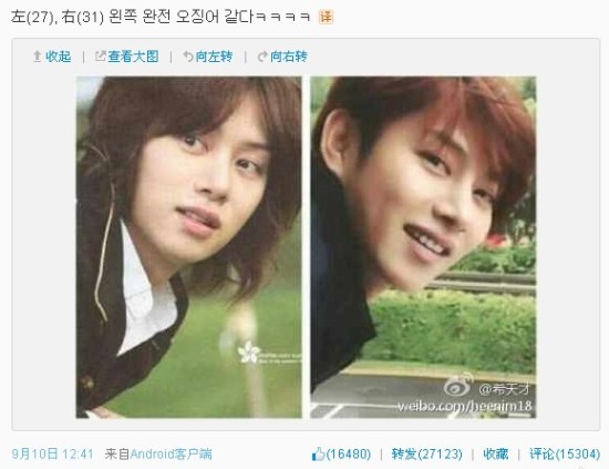 金希澈曾在自己微博上发出隆鼻前后对比照片