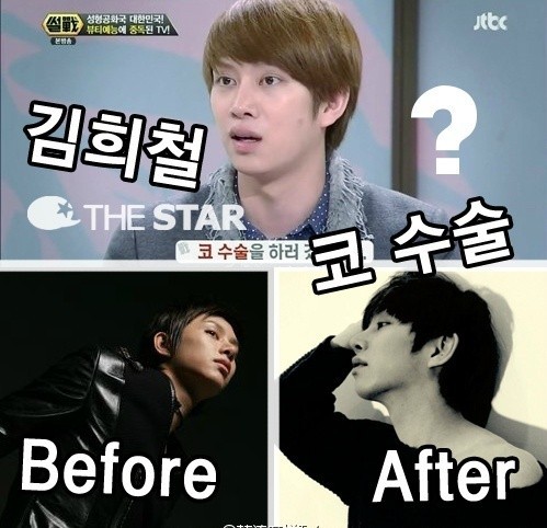 日前,韩国综合编成频道JTBC节目《舌战》批评了最近很受欢迎的整容节目。Super Junior成员金希澈看到整容之后都变成一样的面孔的“江南美人图”的照片,说“这些都是她们贪心所至”。同时公开承认曾因鼻子被摔坏不得不去做隆鼻手术。