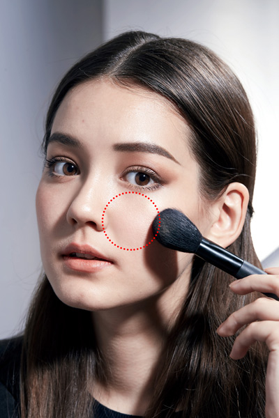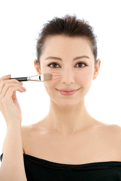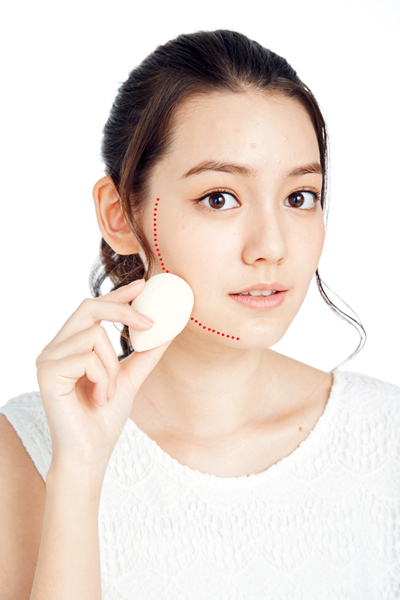 虽然可以用遮盖膏使法令线变浅,但大多数结果都会显得不自然。还会花妆。推荐用腮红使颧骨显高的视觉技巧,可以转移视觉上法令线的注意力。 在笑起来变高的位置,用海绵粉扑涂抹膏状腮红。与底妆一致,腮红也要薄薄涂抹。这样瞬间颧骨就显高了!