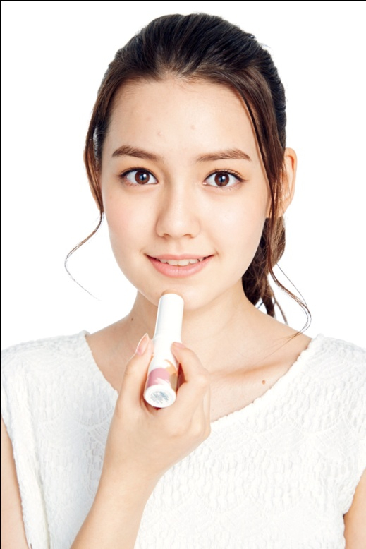 选择比肤色暗的硬质地的遮瑕笔修正痘痘、痘痕、色斑等细节部分。不是涂抹延展开,而是按压涂抹。