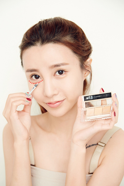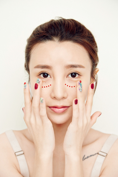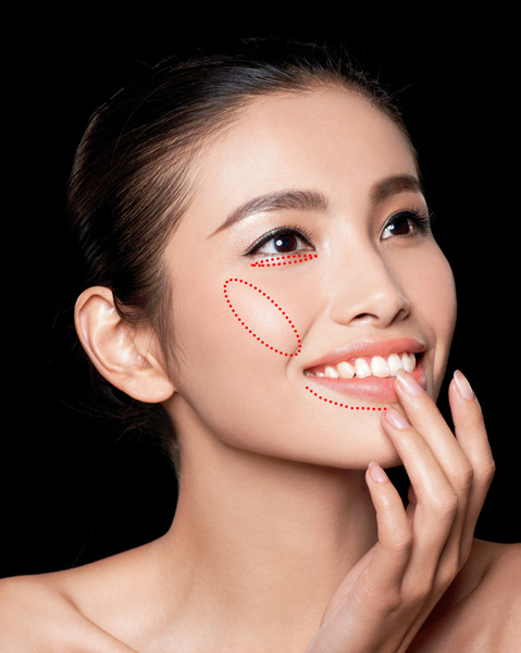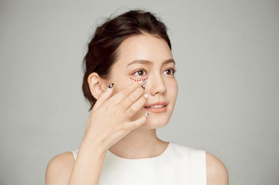 眼角下面、嘴唇下面用膏状高光涂抹上光泽,这些局部有光泽的话脸部整体显得很健康,且显得很明快。不光是消除疲劳感,还能凸显立体感脸部整体紧致。高光粉在局部使用很关键。
