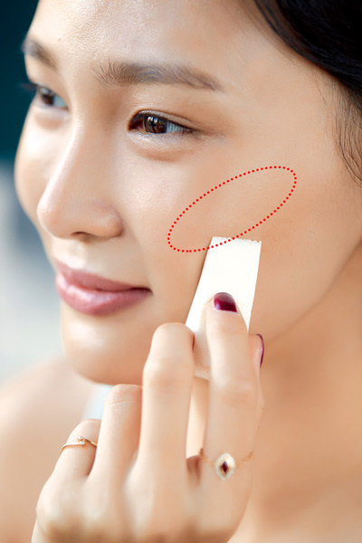 如果皮肤干燥不光是遮瑕膏连粉底都涂抹不上。蜕皮或者干燥引起的细小皱纹如果重叠涂抹底妆的话反而会凸显。在手背上挤出适量清爽质感的精油,用厚实海绵粉扑蘸取后轻轻拍打在这些部位。不光是消除了浮粉还很有光泽。补妆时也能使用的万能技巧。