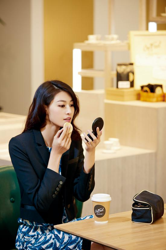 涂抹太多的粉会使质感发生变化,最少限度的涂抹是避免花妆的关键。透明感的散粉以脸部中心为主少量涂抹就完成了。