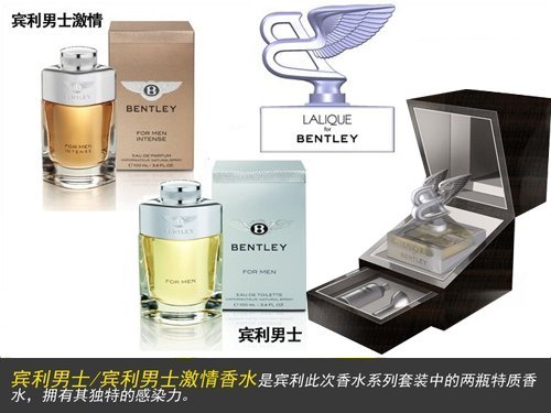另有一款 “Bentley for Men(宾利男士)”与具有强烈感官冲击力的“Bentley for Men Intense(宾利男士激情)”香水,均出自Firmenich香水公司的法国顶尖香水师Nathalie Lorson之手。她凭借精湛的技巧,将豪华汽车品牌宾利的精髓蕴含于精彩无比、不容混淆的香氛体验。为此,她采用最精华的香料成分,包括宾利首款香水必不可少的顶级木料和细腻皮革味道。