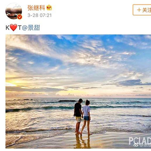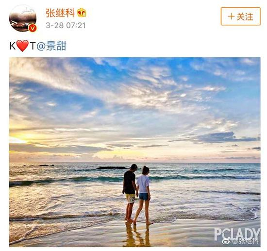 3月28日的07:21,张继科在微博通过一张海滩背影照公布了和景甜的恋情,随后景甜转发盖章认爱。