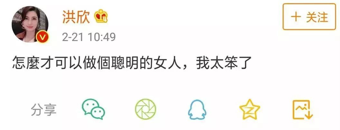 洪欣曾在微博上表达:“怎么才可以做个聪明的女人,我太笨了!”