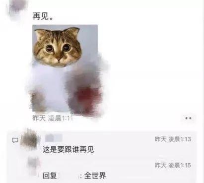 朋友圈里的网友觉得不对劲,便问她和谁再见。她回答是“全世界”。