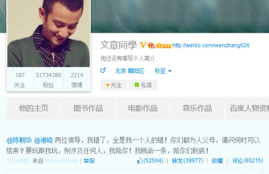 我们总以为事情会就此平息,谁知道文章道歉书一发,两位领导仍然不依不饶。而文章在冲动之下,昨晚又发了一条不应该的微博。我一个糟老头没文化,不懂你们圈的规矩。陈领导问文章,“不明白你发此微博用意何在?”但你们还就此事专门接受采访,还有什么微访谈(其实我也不懂这些都是啥,我连微博都是找年轻的朋友帮我开的,第一次发),好像是我家的大法官出来审判我们,甚至还借用女儿的“且行且珍惜”在你们的微博上反复造句(别人告诉我这叫“伊琍体”),我也很想问,“不明白你们这么做的用意何在?”