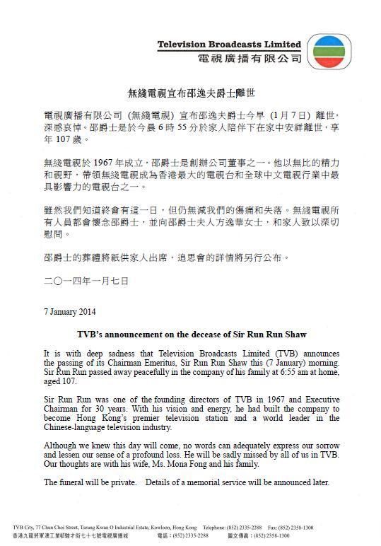 导语:电视广播有限公司(TVB)宣布,公司荣誉主席邵逸夫爵士今晨6时55分于家人陪伴下在家中安详离世,享年107岁(1907年11月19日-2014年1月7日)。