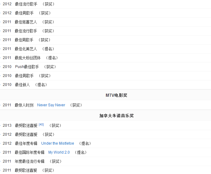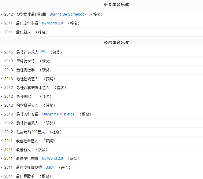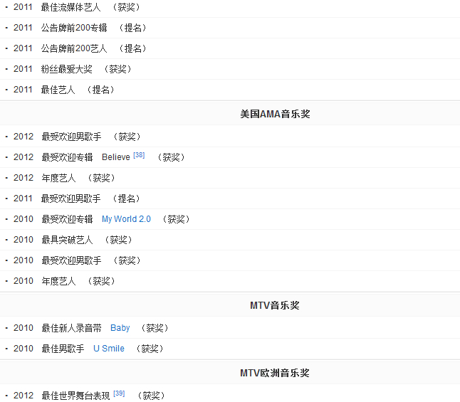 比伯:2008年,被其经纪人斯科特在YouTube发现,随后被亚瑟小子培养进入歌坛。一首《baby》世界传唱。2009年发行第一张个人专辑《My World》。2010年,贾斯汀·比伯获得美国AMA音乐奖年度艺人。出道年龄:15岁