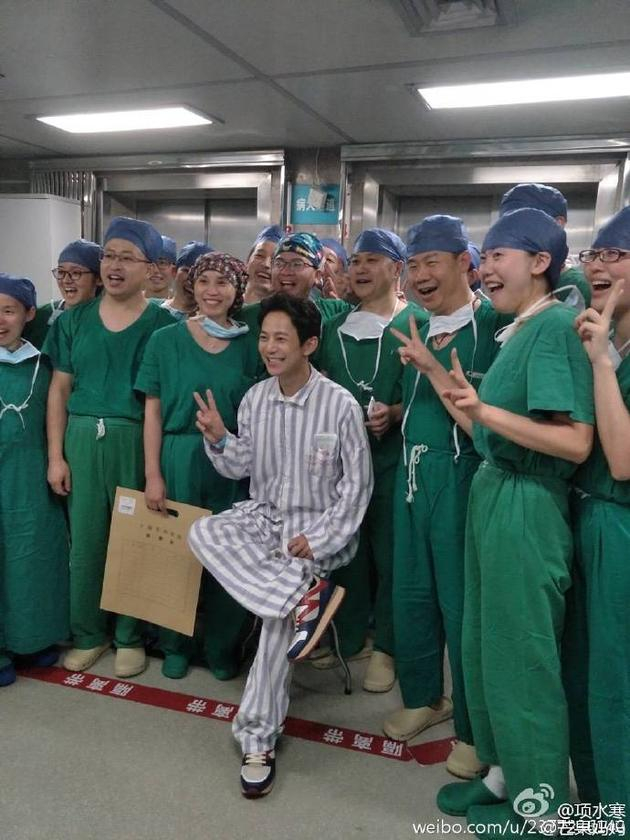 在同一天的晚些时候,有网友通过微博晒何炅和医护人员合影,并称:“何炅,刚刚被送到上海杨浦区某三甲医院,没有骨折,是金属异物插入小腿(心疼)目前手术完毕。看到何老师的笑容就安心了。不过话说拍大合影还有医生自拍!原来何老师的粉丝无处不在!棒棒哒!以后也希望录节目也好、演出也好,一定要注意何老师的安全!么么哒!”照片中,何炅穿着病号服,坐在凳子上,比着剪刀手,露出笑容,看来伤口不是很严重。网友看到照片后也纷纷表示“看到何老师没事就好!注意安全啊!”(我是弥尔)(责编:静电鱼)