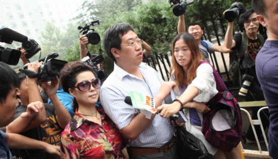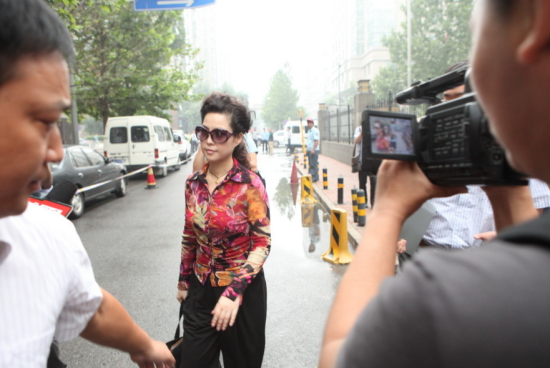 上午9时20分,穿着花衬衣、黑裤子,戴着一副墨镜的梦鸽突然从海淀法院西边的路口往法院大门方向走过来。聚集在警戒线外的上百名记者瞬间冲进警戒线,往梦鸽方向冲去。梦鸽看着大家,站着没动,还稍微转下身,以方便记者们拍照。随后,高高举起的众多照相机围着梦鸽缓缓移动,担任警戒任务的几名警察根本无法阻挡。