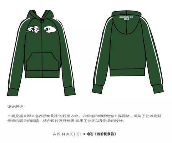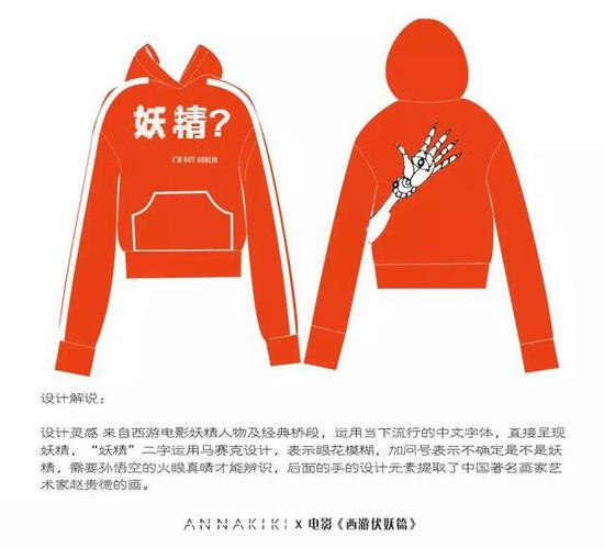 ANNAKIKI与《西游伏妖篇》跨界合作系列以卫衣和夹克两种最具新世代青年时代特性的单品呈现,将传统文化元素以现代时装表达方式传达,这种传统文化和时装艺术的融合和碰撞,便有了ANNAKIKI这充满街头风潮的跨界致敬经典系列。